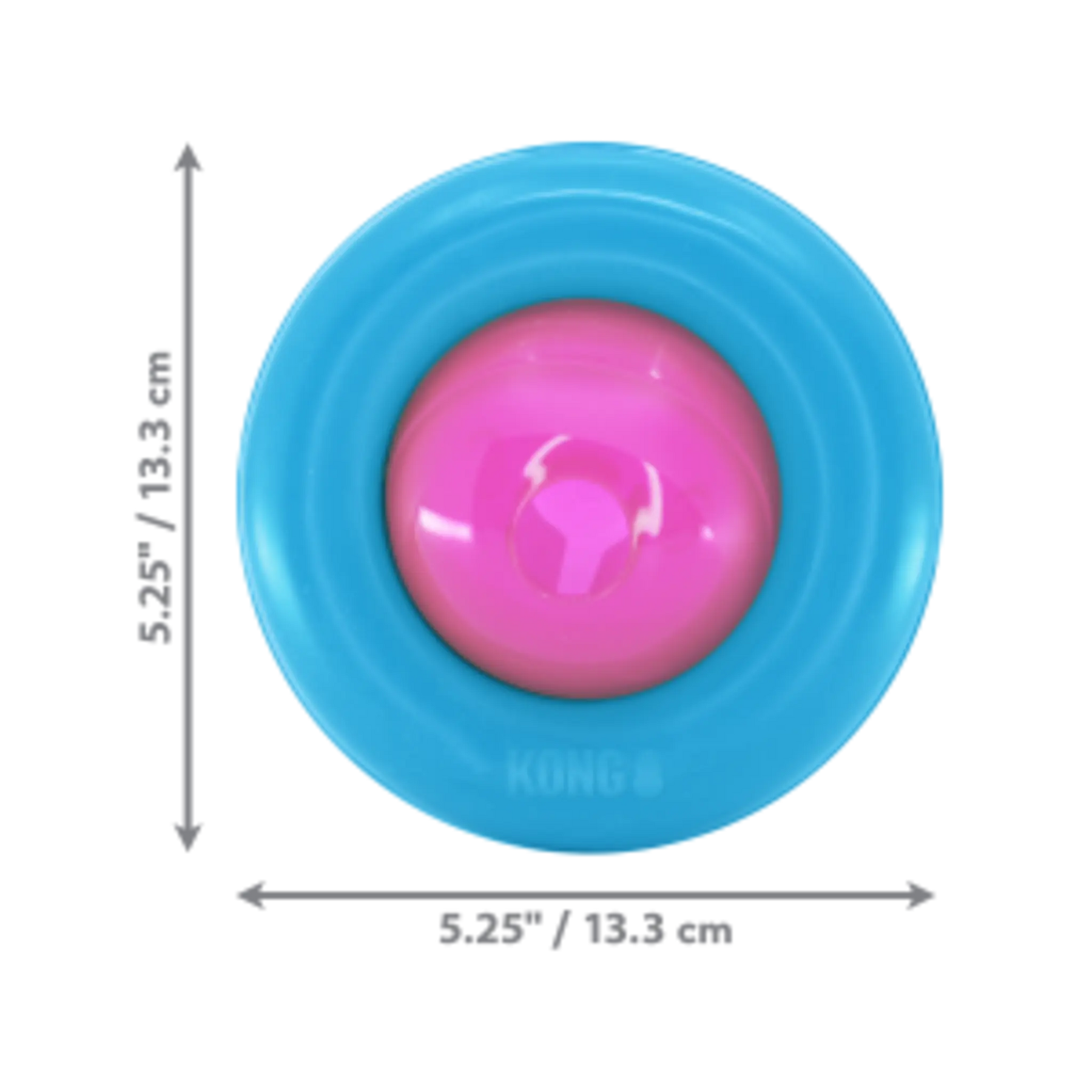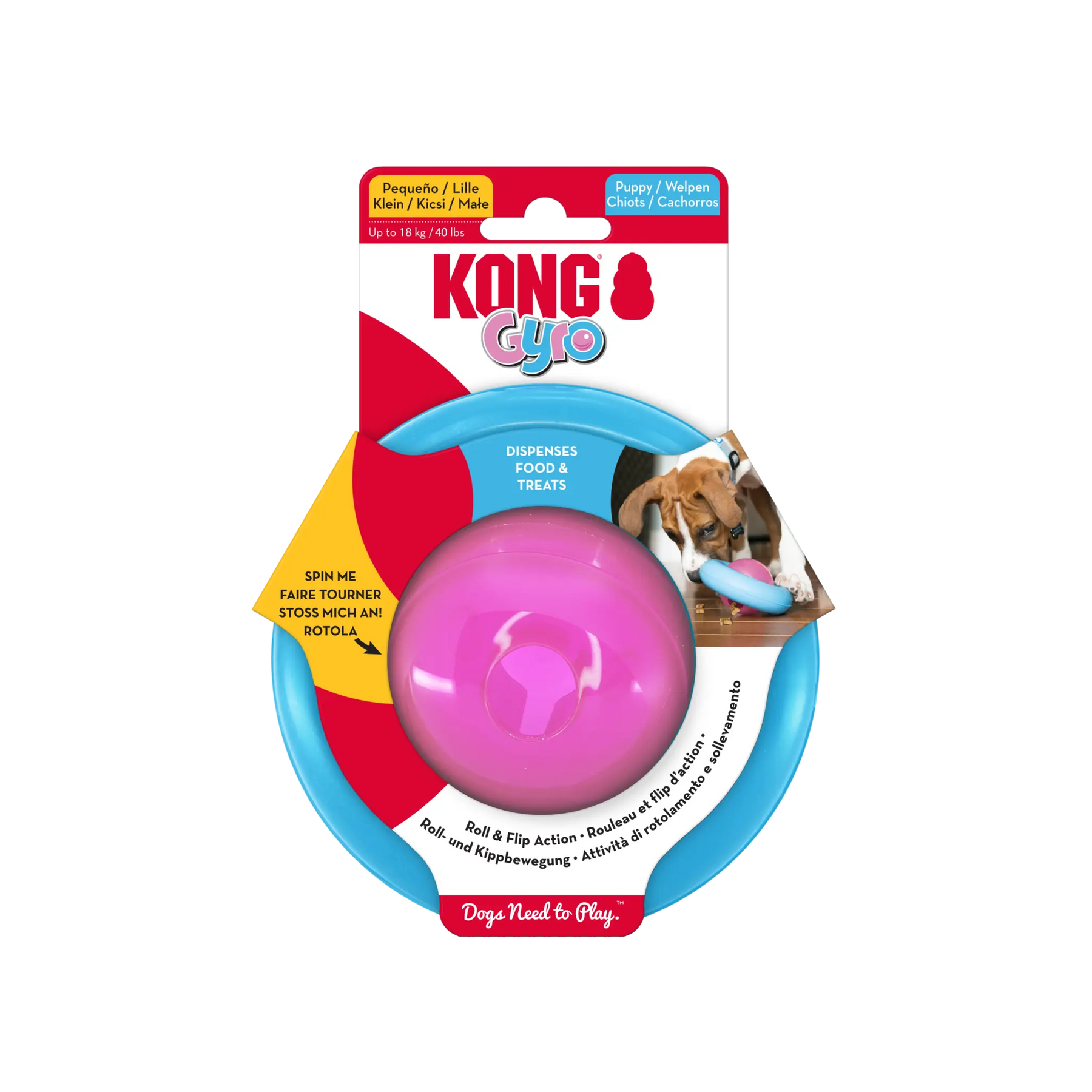 The KONG Gyro is sure to entertain with irresistible roll and flip action keeping dogs enticed and intrigued. With the center spinning orb and static outer ring, this dynamic toy encourages dogs to push, paw and roll the GYRO, delightfully dispensing tasty treat rewards along the way. Ideal for independent play, stuff with snacks or kibble for added fun and extended playtime. Available in large and small sizes.